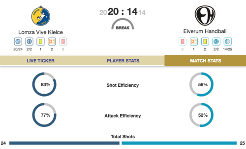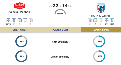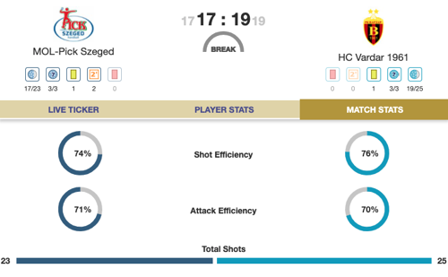 Over in Hungary, Veszprém have also scored 30 goals but the margin is tighter at 30:27. Still, with Jorge Maqueda and Gasper Marguc both on form with eight, it looks like the momentum is on the home team's side.