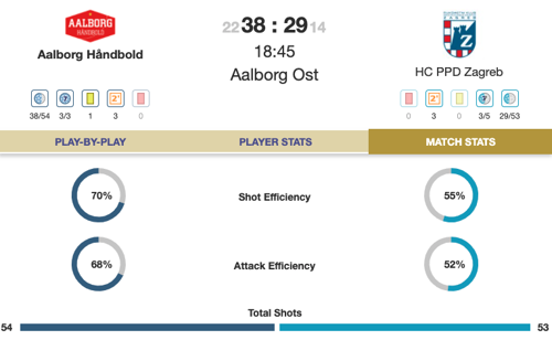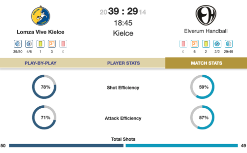 Veszprém started well but the visitors have never let up, and it's a high-scoring 17:17 at the break. Gasper Marguc leads the scoring with six goals, while Gennadiy Komok has had the better day in goal with six saves to five for Rodrigo Corrales.