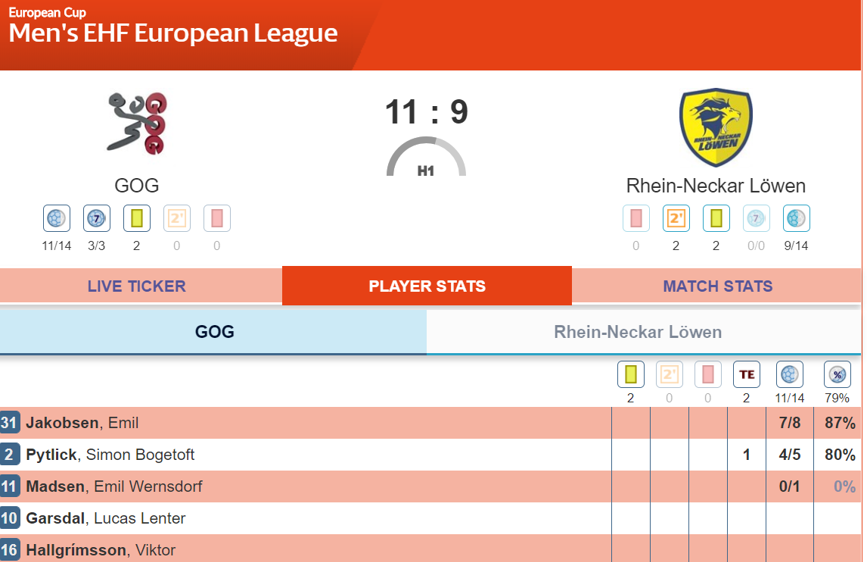 GOG 27:22 RNL: Back in Denmark and GOG are still struggling with RNL. Groetzki has been exceptional from the right wing, barely putting a foot wrong, netting nine from ten shots. While GOG have spread the love a bit on the scoresheet Jacobsen is still the man from the men in yellow and red, he has 12 (!) goals to his name so far.