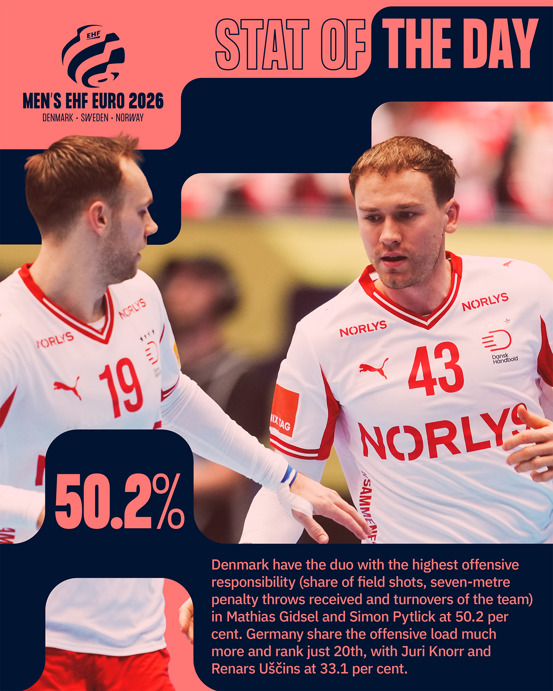 Arguably the most important game of the day in Herning is the last match, between Germany and Denmark. Here's Julian's Rux's stat of the day, demonstrating how important Simon Pytlick and Mathias Gidsel are to the Danish attack. We've seen teams try to shut them down in several previous games - can Germany succeed?