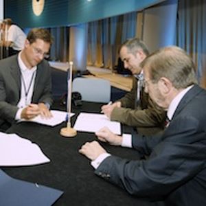 Photo: Belgium's David Van Dorpe, Secretary General, and Patrick Garcia, Vice Secretary General, sign the ISP agreement with EHF President, Tor Lian.