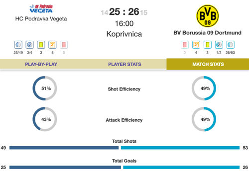 Podravka are showing us that their arena may be prone to thrillers. With just under 10 minutes left, Dortmund just have the advantage, at 23:22.