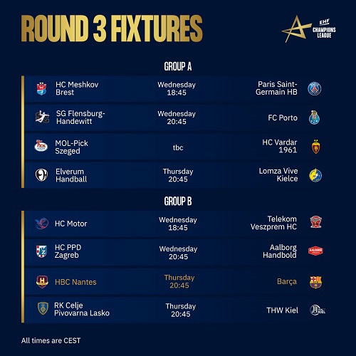 In round 3, the top teams in each group face different challenges: While Flensburg have their home match against Porto tonight, Barça will visit last week’s surprise team, Nantes, in the Match of the Week on Thursday.
