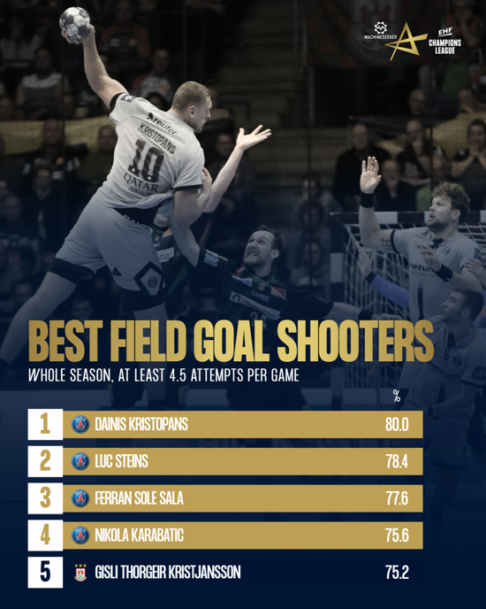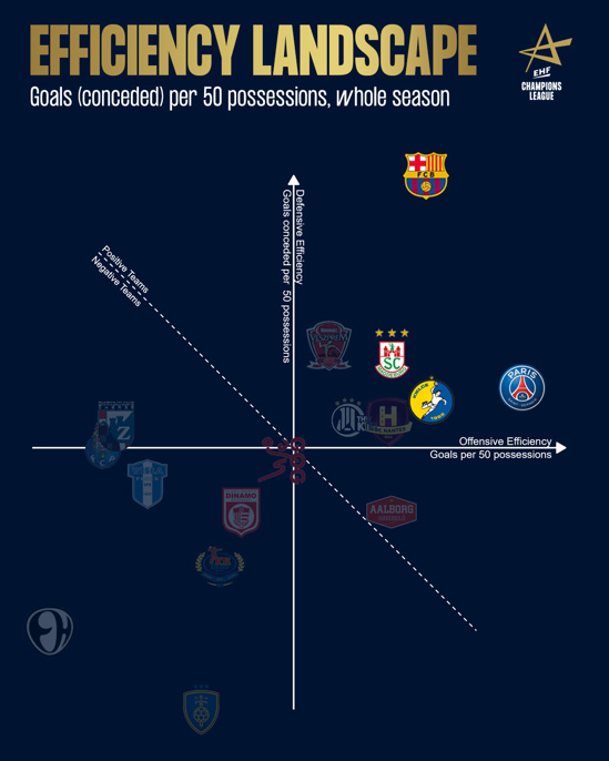 Barça, Barlinek Industria Kielce, Paris Saint-Germain HB and SC Magdeburg lead the competition in offensive efficiency (goals scored per 50 possessions), while in defensive efficiency (goals conceded per 50 possessions) Telekom Veszprém HC squeezes into the top five ahead of Kielce and PSG.