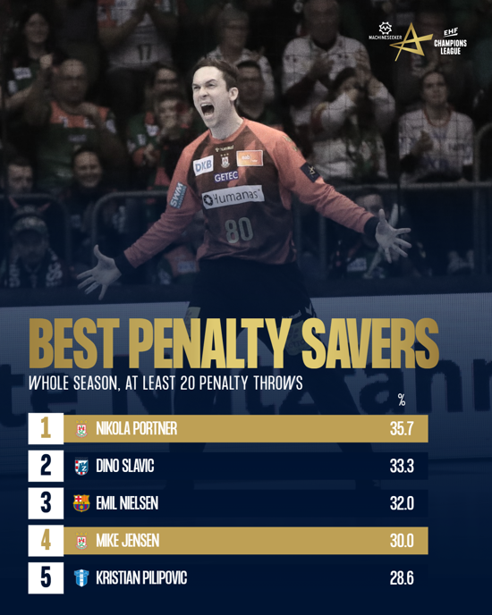 Since SCM’s opponents have the worst penalty throw shooting percentage, Magdeburg’s goalkeeping duo of Mike Jensen and Nicola Portner also rank first – tied with HC PPD Zagreb – in seven-metre save percentage with 33.3 per cent.